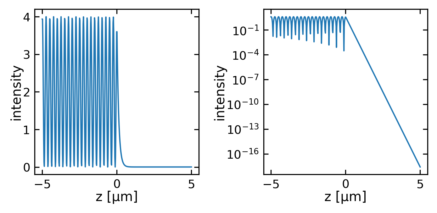 Figure 9— Electric field amplitude (left) and intensity (right) along the propagation direction at a glass(\(n_1=1.5\))/air(\(n_2=1.0\)) interface.