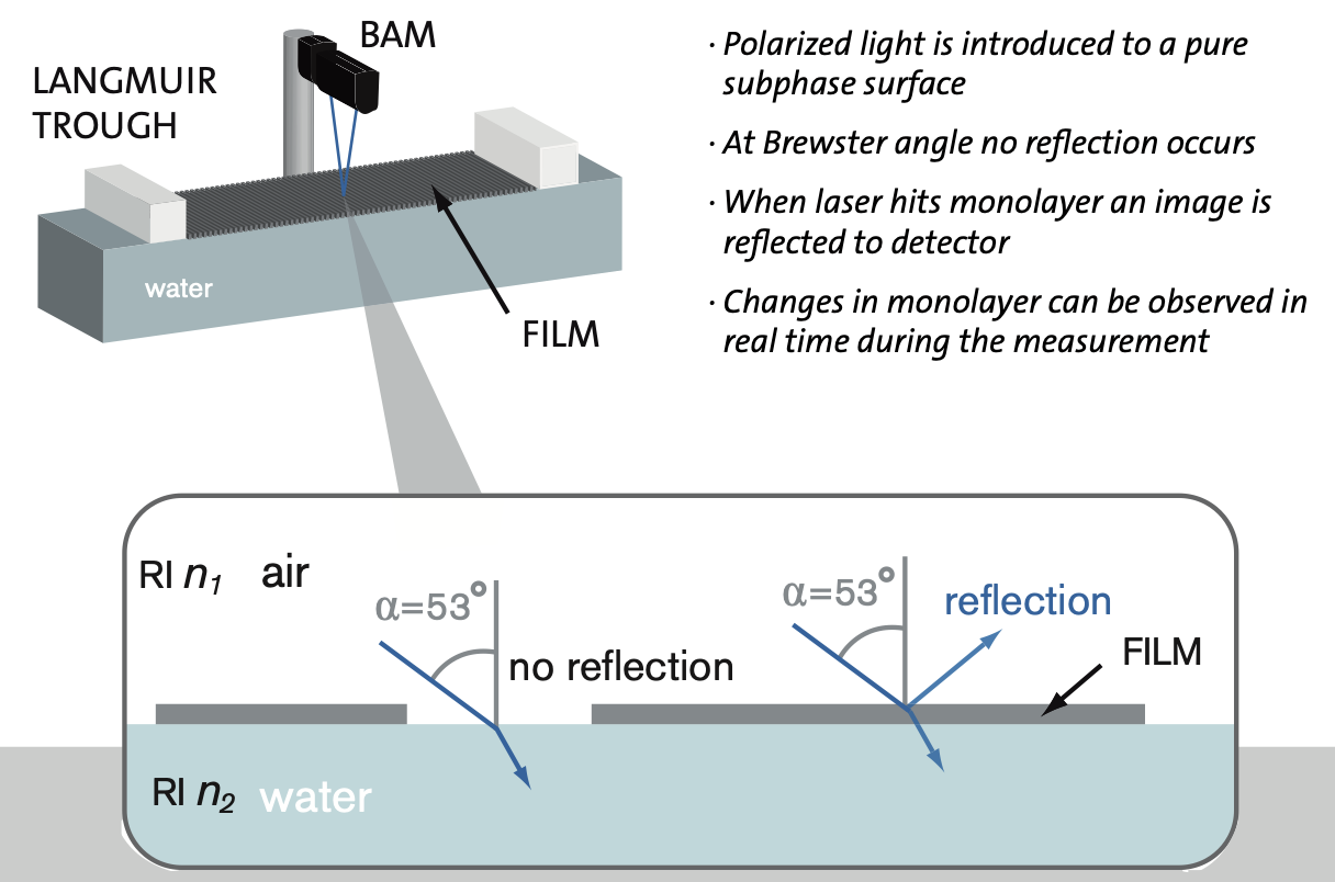 Brewster angle microscopy (BAM) is a powerful surface-sensitive technique that takes advantage of the Brewster angle phenomenon. At the Brewster angle, p-polarized light is completely transmitted through an interface, resulting in zero reflection. However, if there are molecules or thin films present at the interface, they will disturb this condition and create a reflection that can be detected.
