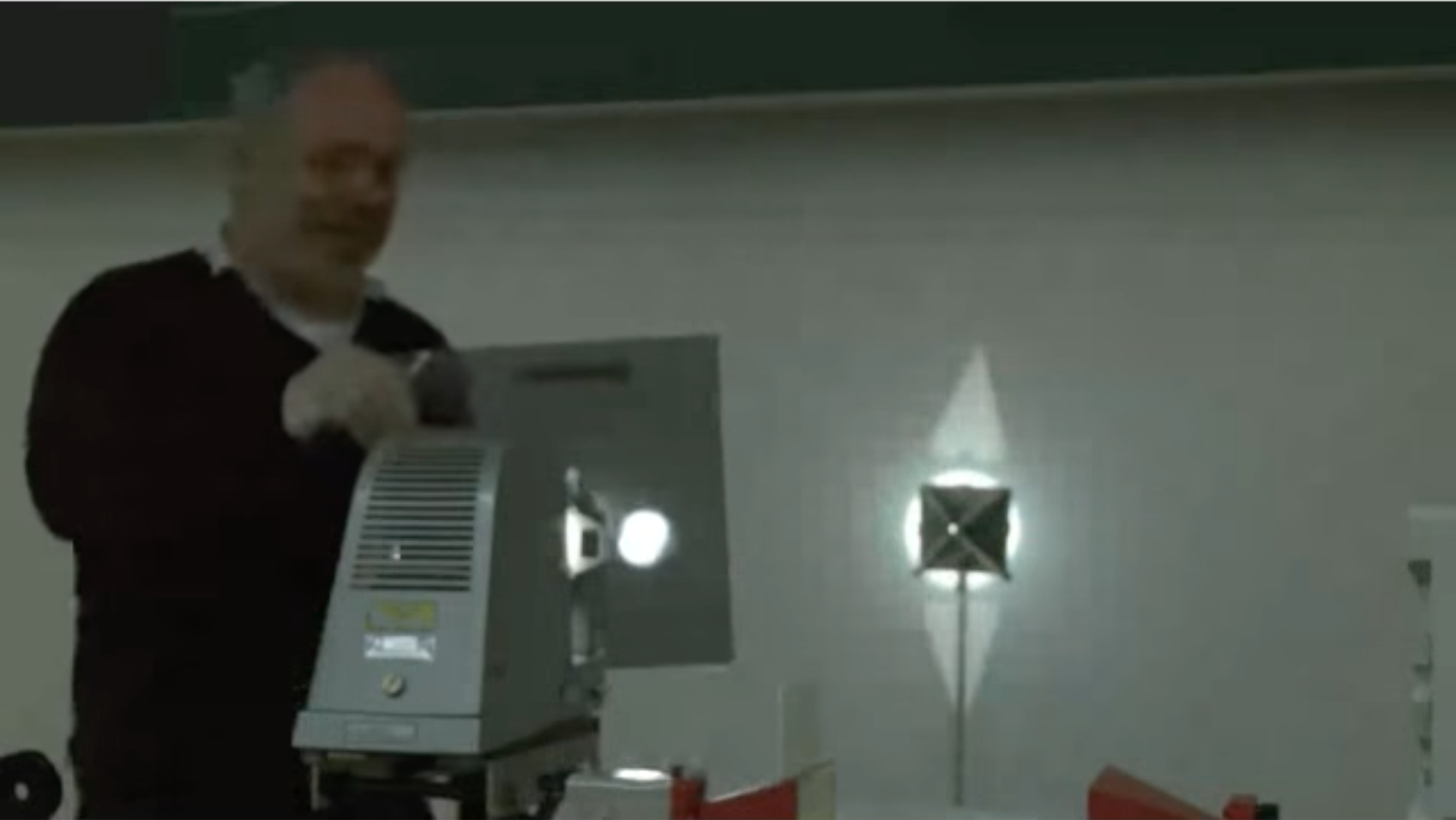 Figure 2— Reflections from a pyramid observed with linear polarizer. The pyramid sides are arranged at an angle, which corresponds to the Brewster angle. If polarized light in a certain direction is falling on the pyramid faces, the reflection disappears.
