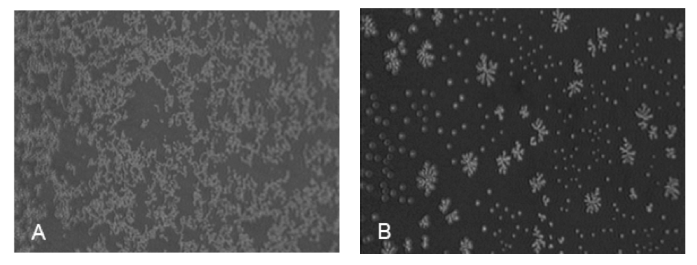 Figure 3— MODEL SKIN LIPIDS a) without and b) with 40 % addition of oleic acid at 10 mN/m imaged with KSV NIMA BAM. The size of the images is ~720 μm (W) × 400 μm (H). With permission from Langmuir 2013, 29 (15), pp 4857–4865. Copyright 2013 American Chemical Society.