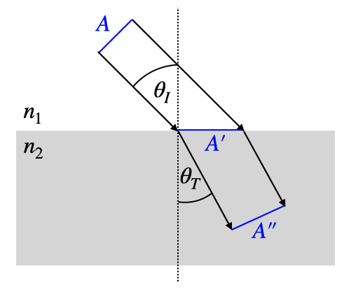 For the transmission we have to be a bit more careful as first of all the light propagates with different phase velocities (refractive index \(n\)) and the cross section of a beam changes due to the refraction at the interface as shown in the image below.