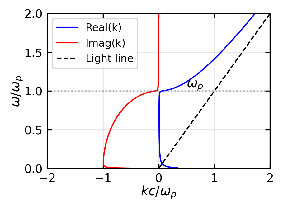 Figure 4— Dispersion relation for electromagnetic waves in a metal according to the Drude model. The light line (dashed) represents the dispersion in vacuum. Note how below the plasma frequency, no propagating waves exist in the metal.