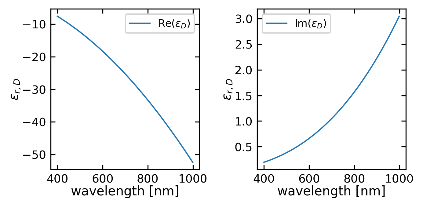 omega_p_d=13.8e15gamma_d=1.075e14#wavelength rangewavelength=np.arange(400,1000,1)def epsilon_d(omega,gamma,omega_p):return(1-omega_p**2/(omega**2+1j*gamma*omega))#conversion from wavelength in angular frequencydef freq(lam): # supply wavelength in nm c=299792458# speed of light m/sreturn(2*np.pi*c/(lam*1e-9))#dielectric function, complex!epsilon=epsilon_d(freq(wavelength),gamma_d,omega_p_d)fig=plt.figure(figsize=get_size(12,6))plt.subplot(121)plt.plot(wavelength,np.real(epsilon),label=r'Re($\epsilon_{D}$)')plt.xlabel('wavelength [nm]')plt.ylabel(r'$\epsilon_{r,D}$')plt.legend()plt.subplot(122)plt.plot(wavelength,np.imag(epsilon),label=r'Im($\epsilon_{D}$)')plt.xlabel('wavelength [nm]')plt.ylabel(r'$\epsilon_{r,D}$')plt.legend()plt.tight_layout()plt.show()