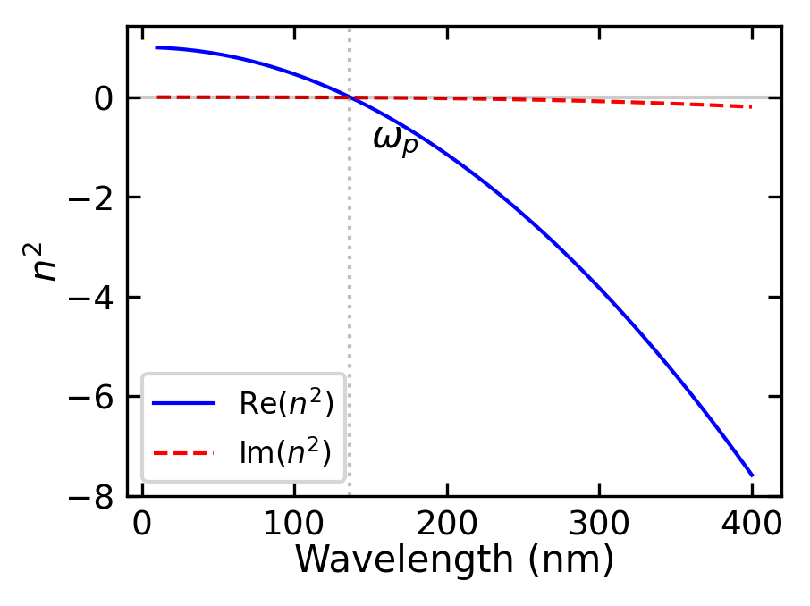 The plot below shows the square of complex refractive index \(n\) for gold according to the Drude model. Interestingly the square of the real part of the refractive index is negative below the plasma frequency. This means that the wave is evanescent and cannot propagate in the metal. This is the reason why metals are opaque in the visible range.