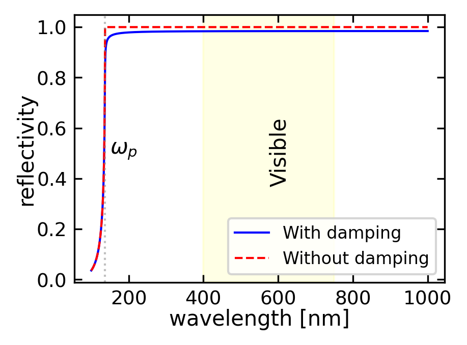 From the square of the refractive index, we can calculate the reflectivity of the metal. The plot below shows the reflectivity of gold with and without damping. Without damping, the reflectivity is exactly 1 below the plasma frequency and drops sharply above it. The damping broadens the reflectivity curve and reduces the reflectivity below the plasma frequency.