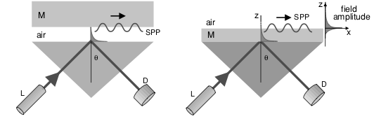 Figure 7— Two different excitation schemes of surface plasmon polaritons for sensing applications. The prism coupling method (left) uses total internal reflection to excite SPPs, while the Kretschmann configuration (right) involves a thin metal film on a dielectric substrate.