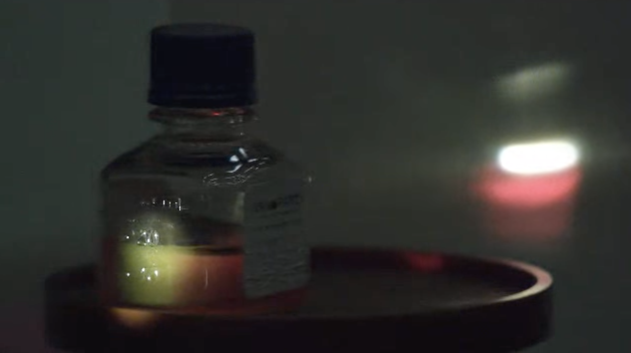 Figure 6— Backscattering and transmission through a 65 nm gold nanoparticle solution. The backscattering is green due to the surface plasmon resonance of the conduction band electrons, while the transmission is red, since the green light is removed by scattering.