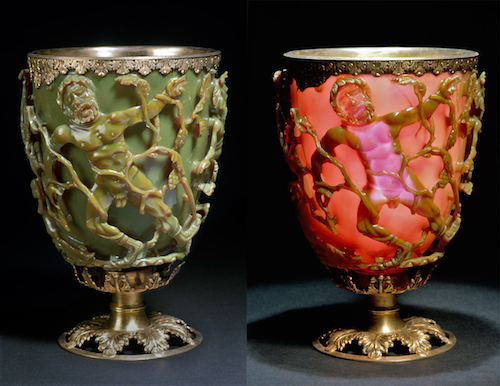Figure 9— The Lycurgus Cup demonstrates the dramatic optical effects of metallic nanoparticles. When viewed in reflected light (left), the cup appears green, while in transmitted light (right), it glows ruby red due to the surface plasmon resonance of embedded gold and silver nanoparticles.