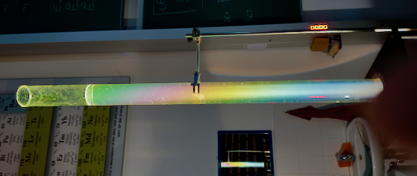 - Differential Scattering: Different wavelengths scatter at different angles due to varying rotation angles. This creates a spatial separation of colors, as each wavelength emerges from the solution at a slightly different angle. The scattering angle \(\theta\) for each wavelength is related to the rotation angle by: