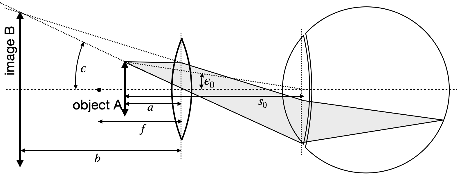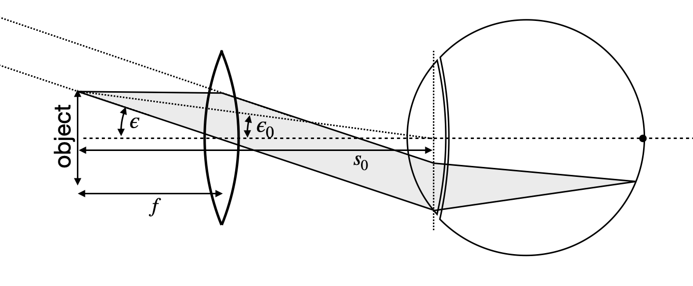 Consider the sketch below. The sketch shows an object of a size \(A\) which is at a distance of \(s_0\) from the eye. The object makes an angle \(\epsilon_0\) with the optical axis. If we insert now a lens into the space between object and eye and the lens is positioned in a way that it is exactly at a distance \(f\) (the focal distance of the lens) from the object then we are able to observe the object under a different angle \(\epsilon\).