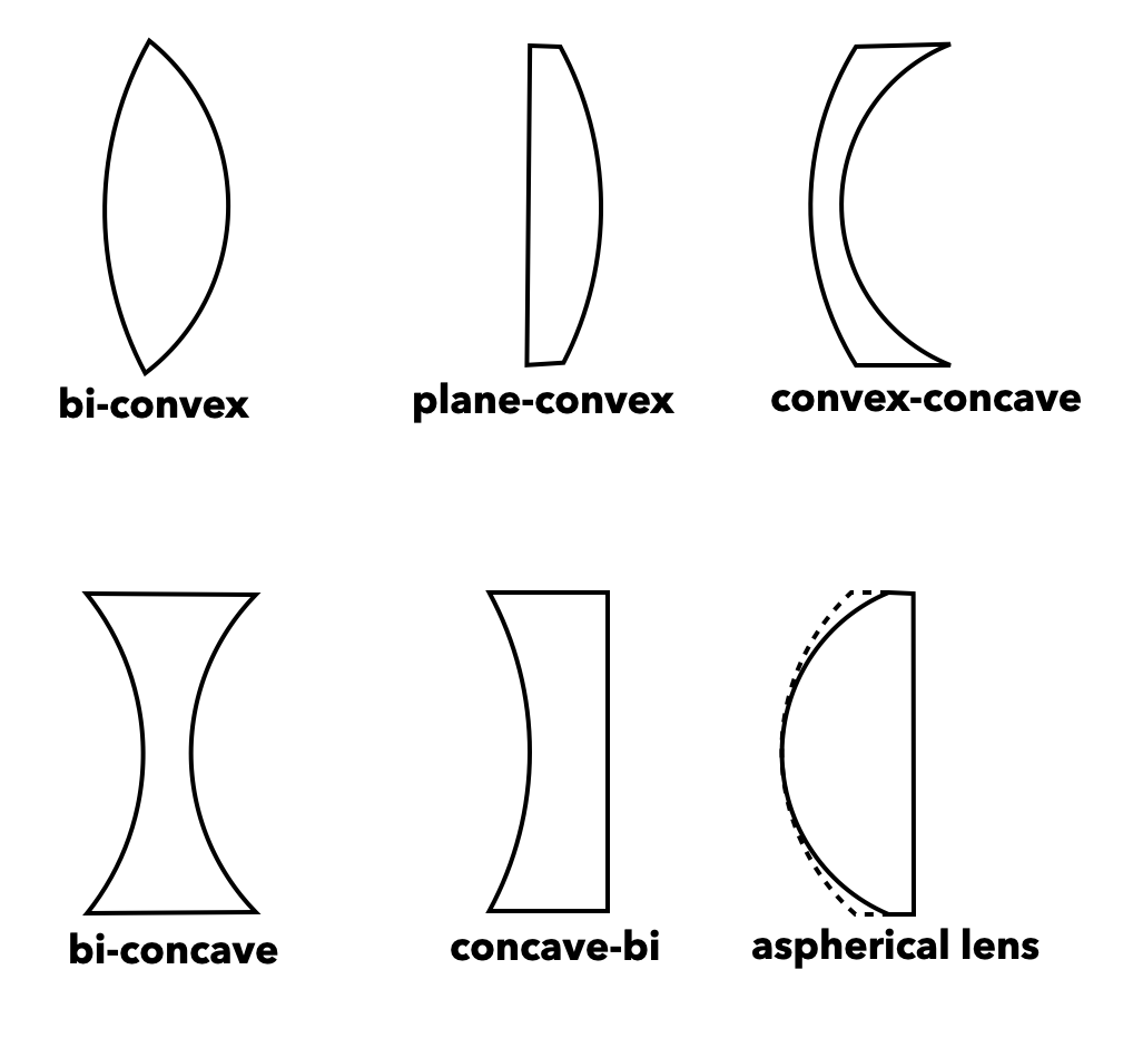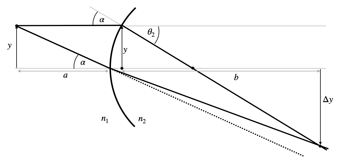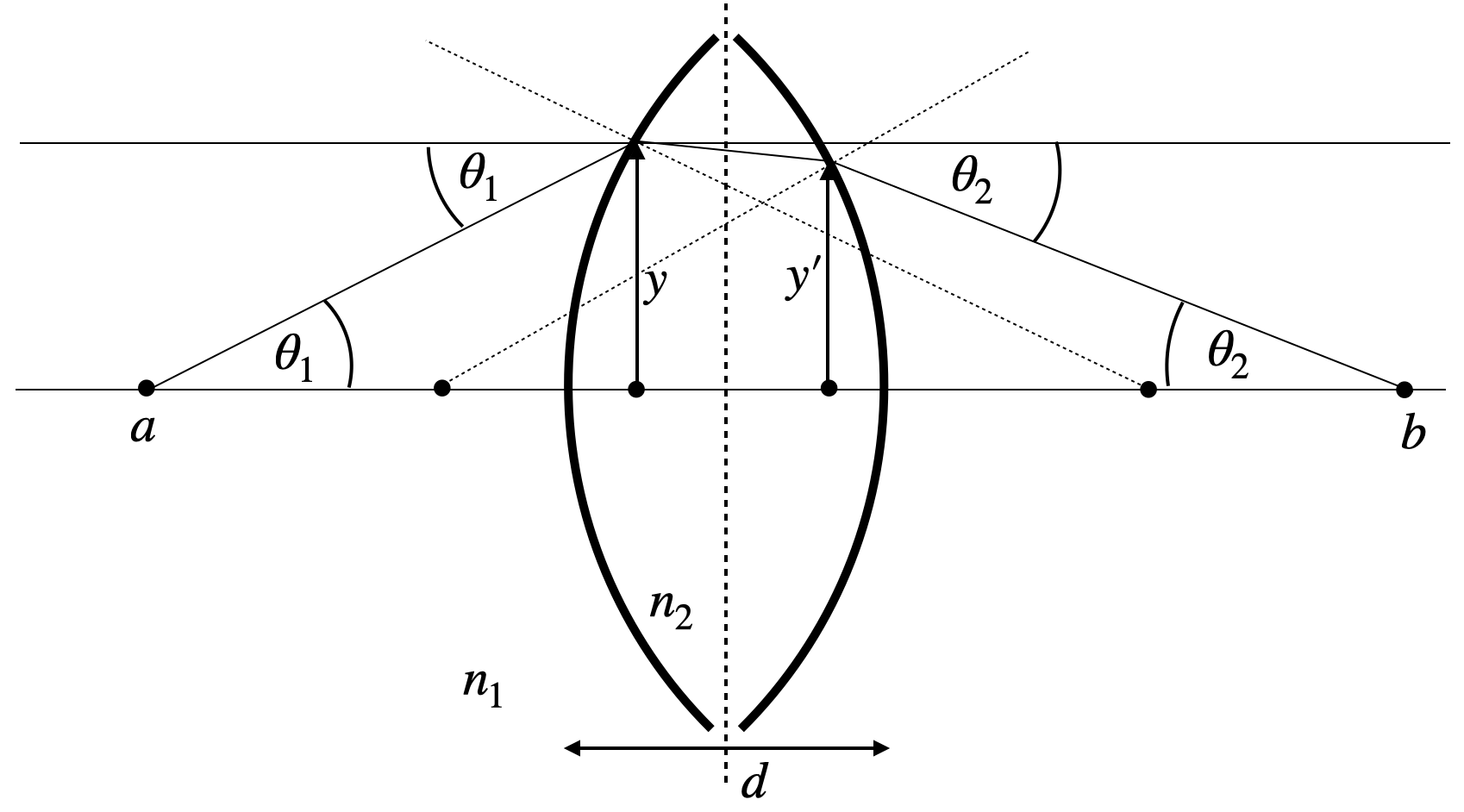 The above derived equations for a single spherical surface yield a linear relation between the input variables \(y_1\) and \(\theta_1\) and the output variables \(y_2\) and \(\theta_2\). The linear relation yields a great opportunity to express optical elements in terms of linear transformations (matrices). This is the basis of matrix optics. The matrix representation of a lens is given by