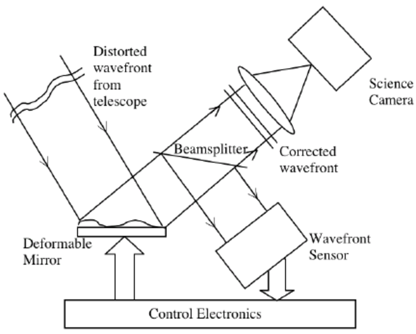 When observing objects from the ground, the atmosphere can distort the image. This is due to the fact that the atmosphere is not homogeneous and the refractive index of the air is changing with time. This leads to a distortion of the image, which can be corrected with the help of adaptive optics. The principle of adaptive optics is to measure the distortion of the image with the help of a laser beam and to correct the image with the help of a deformable mirror. The deformable mirror is a mirror with a number of actuators, which can change the shape of the mirror in order to correct the distortion of the image. The principle of adaptive optics is shown in the figure below.