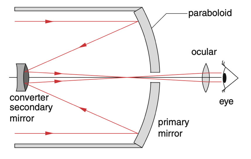 Modern powerful telescopes also use mirrors instead of refracting optical elements, as reflecting elements with nearly 100 percent reflectivity can be built with a much smaller mass than large glass elements. Such telescopes come in different setups. The one below is a Cassegrain telescope, where a secondary convex miror is used for imaging the intermediate image to the eye.