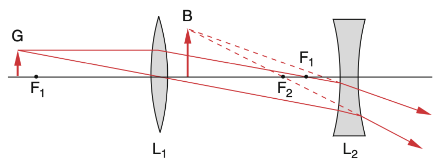 The telescope is therefore made to magnify the angle under which the object is observed. In the same way as a microscope, the telescope consists of two lenses with the focal distances \(f_1,f_2\).