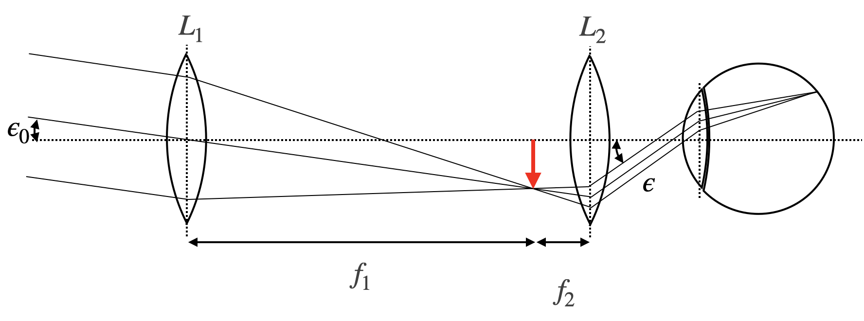 As indicated in the sketch above, the first lens generates an image at the focal length of the first lens. This intermediate image is the magnified by an eye-piece as well acting as a magnifying glass. We may therefore apply the same kind of techniques as earlier for the calculation of the angular magnification. The angle of observation for the object of size \(D\) is given by