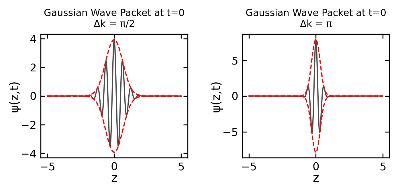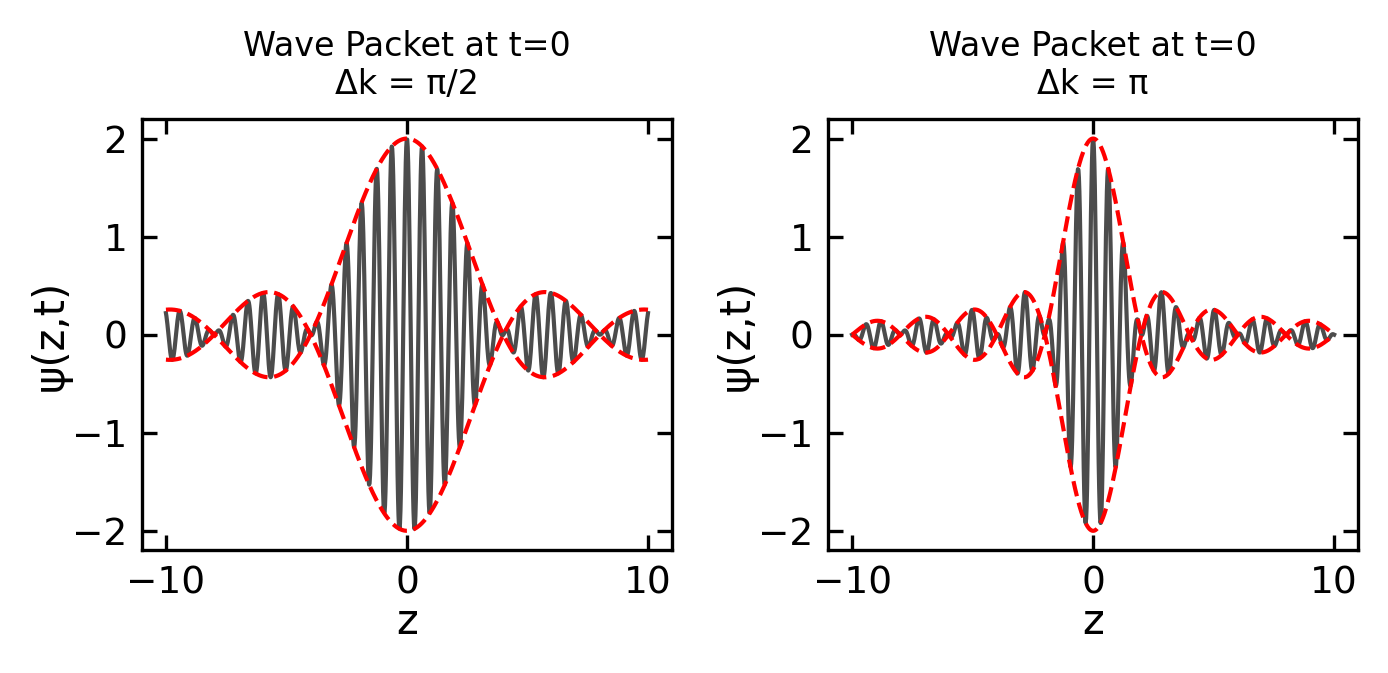 # Parametersk0 =10.0# central wave numberomega0 =2.0# central frequencyC =1.0# amplitude constantt =0# time (starting at t=0)# Spatial gridz = np.linspace(-10, 10, 1000)# Create figure with two subplots side by sidefig, (ax1, ax2) = plt.subplots(1, 2, figsize=get_size(12, 6))# Plot for Delta_k = π/2Delta_k1 = np.pi/2u1 = omega0/k0 * t - zA1 =2* C * np.sinc(Delta_k1 * u1 / (2* np.pi))psi1 = A1 * np.exp(1j* (omega0 * t - k0 * z))ax1.plot(z, np.real(psi1), 'k-', label='Re(ψ)', alpha=0.7)ax1.plot(z, A1, 'r--', label='Envelope A(z,t)', linewidth=1)ax1.plot(z, -A1, 'r--', linewidth=1)ax1.set_xlabel('z')ax1.set_ylabel('ψ(z,t)')ax1.set_title(f'Wave Packet at t=0\nΔk = π/2')#ax1.legend()# Plot for Delta_k = πDelta_k2 = np.piu2 = omega0/k0 * t - zA2 =2* C * np.sinc(Delta_k2 * u2 / (2* np.pi))psi2 = A2 * np.exp(1j* (omega0 * t - k0 * z))ax2.plot(z, np.real(psi2), 'k-', label='Re(ψ)', alpha=0.7)ax2.plot(z, A2, 'r--', label='Envelope A(z,t)', linewidth=1)ax2.plot(z, -A2, 'r--', linewidth=1)ax2.set_xlabel('z')ax2.set_ylabel('ψ(z,t)')ax2.set_title(f'Wave Packet at t=0\nΔk = π')#ax2.legend()plt.tight_layout()plt.show()