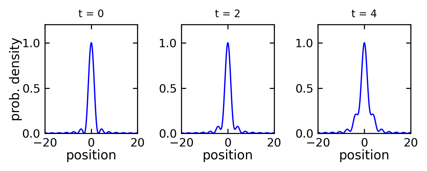 # ParametersN =1000# number of pointsx = np.linspace(-20, 20, N)dx = x[1] - x[0]k =2*np.pi*np.fft.fftfreq(N, dx) # momentum space gridk = np.fft.fftshift(k) # shift k-space gridtimes = [0, 2,4] # three different times# Create rectangular amplitude distribution in k-spacek0 =0.0# center wavevectordk =2.0# width in k-spacepsi_k = np.zeros(N, dtype=complex)mask = (k > k0-dk/2) & (k < k0+dk/2)psi_k[mask] =1.0# Function to calculate wavepacket at time tdef get_wavepacket(t):# Apply time evolution in k-space with dispersion# E = ℏ²k²/2m (using ℏ=m=1) E_k =0.5* k**2# quadratic dispersion relation psi_k_t = psi_k * np.exp(-1j* E_k * t)# Transform to position space psi_x = np.fft.ifftshift(np.fft.ifft(np.fft.ifftshift(psi_k_t)))return np.abs(psi_x)**2# Create three subplotsfig, (ax1, ax2, ax3) = plt.subplots(1, 3, figsize=get_size(12, 5))axes = [ax1, ax2, ax3]# Plot wavepacket at different timesfor ax, t inzip(axes, times): y = get_wavepacket(t) ax.plot(x, y/y.max(), 'b-') ax.set_xlim(-20, 20) ax.set_ylim(0, 1.2) ax.set_xlabel('position')if t ==0: ax.set_ylabel('prob. density') ax.set_title(f't = {t}')plt.tight_layout()plt.show()