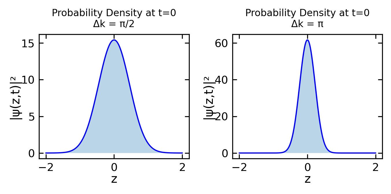 # Parametersk0 =10.0# central wave numberomega0 =2.0# central frequencyC =1.0# amplitude constantt =0# time (starting at t=0)# Spatial gridz = np.linspace(-2, 2, 1000)# Create figure with two subplots side by sidefig, (ax1, ax2) = plt.subplots(1, 2, figsize=get_size(12, 6))# Function to create Gaussian wave packetdef gaussian_wavepacket(z, t, Delta_k): k = np.linspace(k0 -3*Delta_k, k0 +3*Delta_k, 1000) dk = k[1] - k[0]# Gaussian amplitude distribution C_k = C * np.exp(-(k - k0)**2/ (2* Delta_k**2))# Calculate wave packet through integration psi = np.zeros(len(z), dtype=complex)for i, ki inenumerate(k): psi += C_k[i] * np.exp(1j* (omega0 * t - ki * z)) * dkreturn psi# Plot for Delta_k = π/2Delta_k1 = np.pi/2psi1 = gaussian_wavepacket(z, t, Delta_k1)prob_density1 = np.abs(psi1)**2ax1.plot(z, prob_density1, 'b-', label='|ψ|²')ax1.fill_between(z, prob_density1, alpha=0.3)ax1.set_xlabel('z')ax1.set_ylabel('|ψ(z,t)|²')ax1.set_title(f'Probability Density at t=0\nΔk = π/2')# Plot for Delta_k = πDelta_k2 = np.pipsi2 = gaussian_wavepacket(z, t, Delta_k2)prob_density2 = np.abs(psi2)**2ax2.plot(z, prob_density2, 'b-', label='|ψ|²')ax2.fill_between(z, prob_density2, alpha=0.3)ax2.set_xlabel('z')ax2.set_ylabel('|ψ(z,t)|²')ax2.set_title(f'Probability Density at t=0\nΔk = π')plt.tight_layout()plt.show()