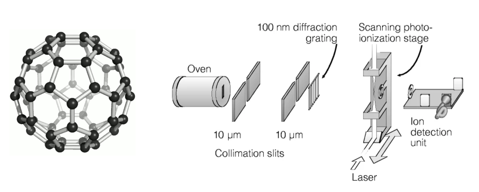 Experiments like that can even be extended to molecules. Below is an example for diffraction experiments in \(C_{60}\) molecules by the group of Zeilinger in Vienna from 1999. \(C_{60}\) are large molecules (buckyball molecules or Buckminsterfullerenes) consisting of 60 carbon atoms.