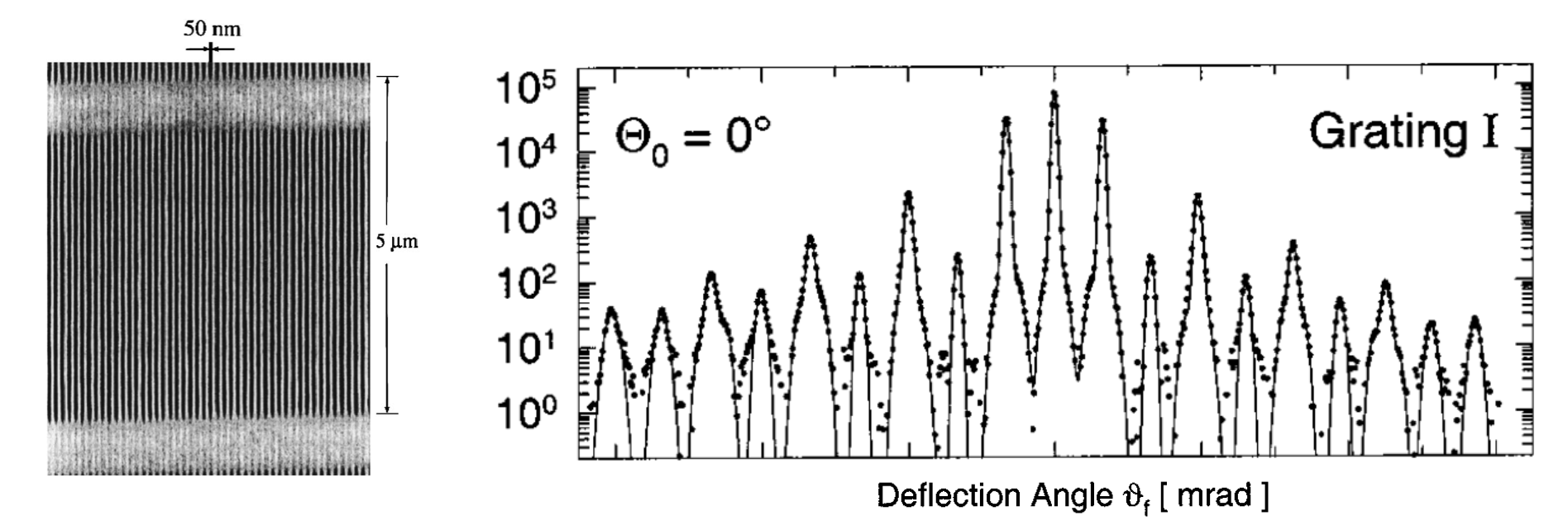 Below is an example of atomic diffraction by the group of Toennies in Göttingen from 2000. In this experiment Helium atoms were directed onto a nanofabricated grating. ::: {#fig-toennies align=center}