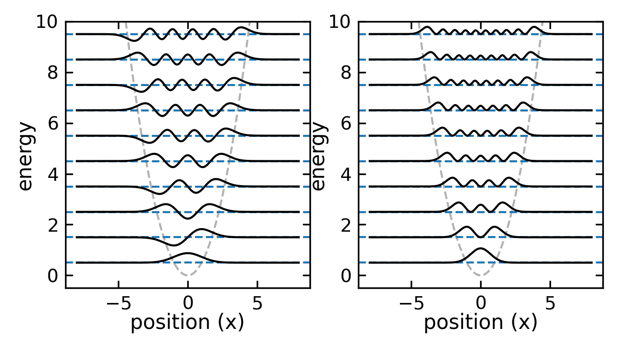 def psi_n(x, n): N =1.0/np.sqrt(2**n * math.factorial(n) * np.pi**0.5) H = hermite(n)return N * H(x) * np.exp(-x**2/2)# Parametersx = np.linspace(-8, 8, 1000)# Create potential energy functionV =0.5* x**2# Create figure with two subplotsfig, (ax1, ax2) = plt.subplots(1, 2, figsize=get_size(12, 6))# First subplot - wavefunctionsax1.plot(x, V, 'k--', label='V(x)', alpha=0.3)for n inrange(10): psi = psi_n(x, n) E_n = n +0.5 ax1.axhline(E_n, ls="--") ax1.plot(x, psi*0.5+ E_n, "k-", label=f'n={n}')ax1.set_xlabel('position (x)')ax1.set_ylabel('energy')ax1.set_ylim(-0.5, 10)# Second subplot - magnitude squareax2.plot(x, V, 'k--', label='V(x)', alpha=0.3)for n inrange(10): psi = psi_n(x, n) E_n = n +0.5 ax2.axhline(E_n, ls="--") ax2.plot(x, np.abs(psi)**2+ E_n, "k-", label=f'n={n}')ax2.set_xlabel('position (x)')ax2.set_ylabel('energy')ax2.set_ylim(-0.5, 10)plt.show()