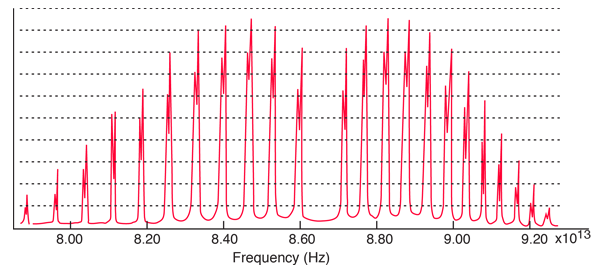 Figure 3— Rotational side band of the vibrational transition from the ground state \(n=0\) to the excited state \(n=1\) of HCl in the gas phase.