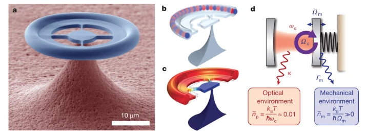 Figure 5— a, False-colour scanning electron micrograph of a spoke-anchored toroidal resonator 31 µm in diameter used for the optomechanical experiments reported in this work. b, Sketch of an optical whispering gallery mode in the microresonator (colours indicate optical phase). c, Simulated displacement (exaggerated for clarity) of the fundamental radial breathing mode of the structure. d, Equivalent optomechanical Fabry–Pérot cavity: quantum-coherent coupling is achieved when the enhanced coupling rate Ωc is comparable to or exceeds the optical and mechanical decoherence rates . Owing to the large asymmetry between mechanical and optical frequencies, the occupancies of the two environments are widely different. ( taken from Quantum-coherent coupling of a mechanical oscillator to an optical cavity mode)