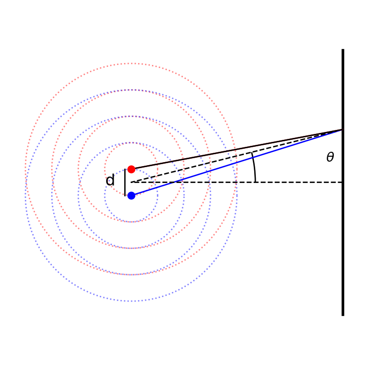 def plot_angle(ax, pos, angle, length=0.95, acol="C0", **kwargs): vec2 = np.array([np.cos(np.deg2rad(angle)), np.sin(np.deg2rad(angle))]) xy = np.c_[[length, 0], [0, 0], vec2*length].T + np.array(pos) ax.plot(*xy.T, color=acol,ls="--")return AngleAnnotation(pos, xy[0], xy[2], ax=ax, **kwargs)plt.figure(figsize=get_size(12,12))# Point sources positionsd =2# source separationy1, z1 =0, -d/2# source 1y2, z2 =0, d/2# source 2# Draw circular wavefrontstheta = np.linspace(0, 2*np.pi, 100)n_circles =5wavelength =2# spacing between wavefrontsfor i inrange(n_circles): r = i * wavelength# Wavefronts from source 1 plt.plot(r*np.cos(theta) + y1, r*np.sin(theta) + z1, 'b:', alpha=0.5)# Wavefronts from source 2 plt.plot(r*np.cos(theta) + y2, r*np.sin(theta) + z2, 'r:', alpha=0.5)# Draw screenscreen_z = np.linspace(-10, 10, 100)screen_y = np.ones_like(screen_z) *16plt.plot(screen_y, screen_z, 'k-', linewidth=2, label='Screen')# Example point on screenP = np.array([16, 4]) # point coordinates [y, z]# Draw paths from sources to point Pplt.plot([y1, P[0]], [z1, P[1]], 'b-', label='Path 1')plt.plot([y2, P[0]], [z2, P[1]], 'r-', label='Path 2')plt.plot([0, P[0]], [z2, P[1]], 'k-', label='Path 2')# Calculate and show path lengthsr1 = np.sqrt((P[0]-y1)**2+ (P[1]-z1)**2)r2 = np.sqrt((P[0]-y2)**2+ (P[1]-z2)**2)path_diff =abs(r2 - r1)# Add sourcesplt.plot(y1, z1, 'bo', label='Source 1')plt.plot(y2, z2, 'ro', label='Source 2')# Label source separationplt.plot([y1-0.5, y1-0.5], [z1, z2], 'k-', linewidth=1)plt.text(y1-2, -.2, 'd', fontsize=12)# Add angle annotationcenter = np.array([0, 0]) # center between sourcesangle = np.arctan2(P[1], P[0]) # angle to point Pkw =dict(size=500, unit="points", text=r"$\theta$")plot_angle(plt.gca(), center, angle*180/np.pi, length=16,acol="k",textposition="inside", **kw)plt.xlabel('y')plt.ylabel('z')plt.axis("equal")plt.axis('off')plt.show()