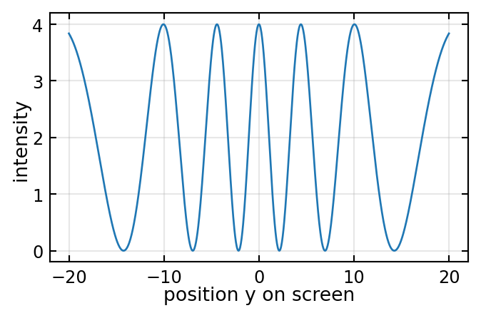 Intensity pattern of two sources at a screen at a distance L. The sources are separated by a distance d and the wavelength of the waves is \(\lambda\).
