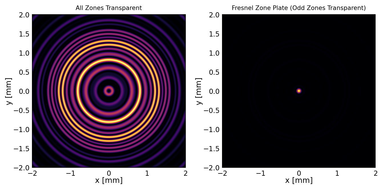 def spherical_wave(k, omega, r, r0, t): d = np.linalg.norm(r - r0[:, np.newaxis, np.newaxis], axis=0)return np.exp(1j* (k * d - omega * t)) / dwavelength =532e-9# Wavelength of light (532 nm)k0 =2* np.pi / wavelength # Wave numberc =299792458# Speed of light in m/somega0 = k0 * c # Angular frequencyt =0# Time# Observation plane at the focal distance r0r0 =0.5# 0.5 m (50 cm)# Create observation grid at z = 0 (focal plane)x = np.linspace(-2e-3, 2e-3, 800)y = np.linspace(-2e-3, 2e-3, 800)X, Y = np.meshgrid(x, y)r = np.array([X, Y, np.zeros_like(X)]) # Observation points at z = 0num_zones =10m_values = np.arange(1, num_zones +1) # m from 1 to num_zonesrho_m = np.sqrt(m_values * r0 * wavelength) # Radii of the zonespoints_per_zone =200# Adjust for performance vs. accuracytotal_field_all = np.zeros_like(X, dtype=complex)total_field_zone_plate = np.zeros_like(X, dtype=complex)# Loop over zonesfor idx, m inenumerate(m_values):# Angle positions around the ring theta = np.linspace(0, 2* np.pi, points_per_zone, endpoint=False)# Radius of the current zone radius = rho_m[idx]# Source positions on the ring (in the aperture plane at z = -r0) x0 = radius * np.cos(theta) y0 = radius * np.sin(theta) z0 =-r0 * np.ones_like(x0) # All sources in the aperture plane at z = -r0# Sources array sources = np.array([x0, y0, z0])# Field contributions from this zone field_zone = np.zeros_like(X, dtype=complex)# Sum contributions from all sources in the zonefor i inrange(sources.shape[1]): r0_source = sources[:, i] field = spherical_wave(k0, omega0, r, r0_source, t) field_zone += field# Add to total field for all zones total_field_all += field_zone# Add to total field for zone plate if zone is odd-numberedif m %2==1: # m is odd (1, 3, 5, ...) total_field_zone_plate += field_zone# Compute intensitiesintensity_all = np.abs(total_field_all)**2intensity_zone_plate = np.abs(total_field_zone_plate)**2# Normalize intensities for better comparisonintensity_all /= np.max(intensity_all)intensity_zone_plate /= np.max(intensity_zone_plate)# Plottingfig, axs = plt.subplots(1, 2, figsize=get_size(18, 10))extent = [np.min(x)*1e3, np.max(x)*1e3, np.min(y)*1e3, np.max(y)*1e3] # in mm# All zones transparentim1 = axs[0].imshow(intensity_all, extent=extent, origin='lower', cmap='inferno')axs[0].set_title('All Zones Transparent')axs[0].set_xlabel('x [mm]')axs[0].set_ylabel('y [mm]')#plt.colorbar(im1, ax=axs[0], label='Normalized Intensity')# Fresnel Zone Plateim2 = axs[1].imshow(intensity_zone_plate, extent=extent, origin='lower', cmap='inferno')axs[1].set_title('Fresnel Zone Plate (Odd Zones Transparent)')axs[1].set_xlabel('x [mm]')axs[1].set_ylabel('y [mm]')#plt.colorbar(im2, ax=axs[1], label='Normalized Intensity')plt.tight_layout()plt.show()