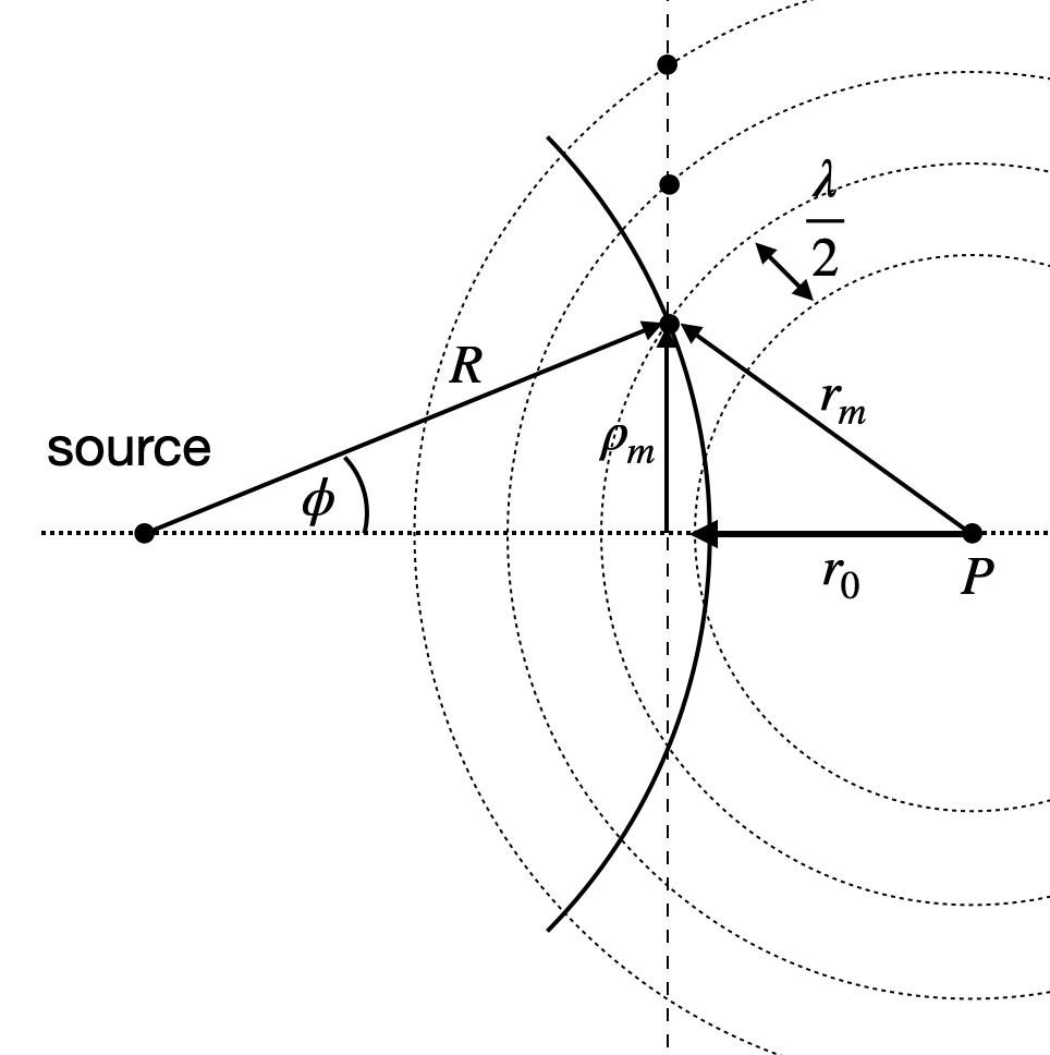 We want to take a more general look at diffraction by exploring a concept known as Fresnel zones. Consider spherical waves of wavelength \(\lambda\) emitted from a source, as indicated by the solid line in the sketch below.