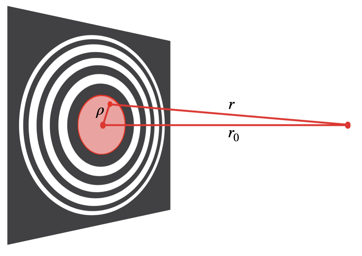 If we now fill the ring from \(\rho_m\) to \(\rho_{m+1}\) on a glass slide but leave the ring from \(\rho_{m+1}\) to \(\rho_{m+2}\) transparent, we create a so-called Fresnel zone plate. Here, the radius in the first zone \(r\) ranges from \(r_0\) to \(r_0 + \lambda/2\). The next zone will range from \(r_0 + \lambda/2\) to \(r_0 + \lambda\) but is removed from its contribution to the point.