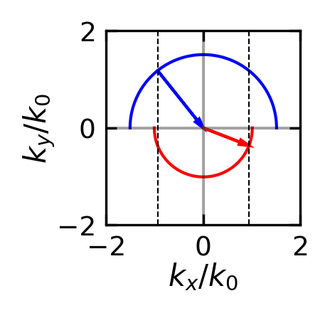 theta_upper = np.linspace(0, np.pi, 100) # Upper half circletheta_lower = np.linspace(np.pi, 2*np.pi, 100) # Lower half circle# Radii for the circlesr1 =1.51# Radius for upper half circler2 =1.01# Radius for lower half circlex_upper = r1 * np.cos(theta_upper)y_upper = r1 * np.sin(theta_upper)x_lower = r2 * np.cos(theta_lower)y_lower = r2 * np.sin(theta_lower)# Create the plotplt.figure(figsize=get_size(4, 3))plt.plot(x_upper, y_upper, 'b-', label=f'Upper radius = {r1}')plt.plot(x_lower, y_lower, 'r-', label=f'Lower radius = {r2}')# Add arrow# Calculate arrow start point (on the upper circle at 135 degrees)arrow_start_x = r1 * np.cos(3*np.pi/4.2) # 135 degrees in radiansarrow_start_y = r1 * np.sin(3*np.pi/4.2)# Add arrow to origin (0,0)plt.arrow(arrow_start_x, arrow_start_y, -arrow_start_x, -arrow_start_y, head_width=0.1, head_length=0.2, fc='b', ec='b', length_includes_head=True, label='45° arrow')dy=np.sqrt(r2**2-arrow_start_x**2)plt.arrow(0, 0, -arrow_start_x, -dy, head_width=0.1, head_length=0.2, fc='r', ec='r', length_includes_head=True, label='45° arrow')plt.axhline(y=0, color='k', linestyle='-', alpha=0.3)plt.axvline(x=0, color='k', linestyle='-', alpha=0.3)plt.axvline(x=-arrow_start_x, color='k', linestyle='--',lw=0.5)plt.axvline(x=arrow_start_x, color='k', linestyle='--', lw=0.5)plt.axis('square')plt.grid(True, alpha=0.3)plt.xlabel(r'$k_x/k_0$')plt.ylabel(r'$k_y/k_0$')plt.xlim(-2,2 )plt.ylim(-2,2 )# Show the plotplt.show()