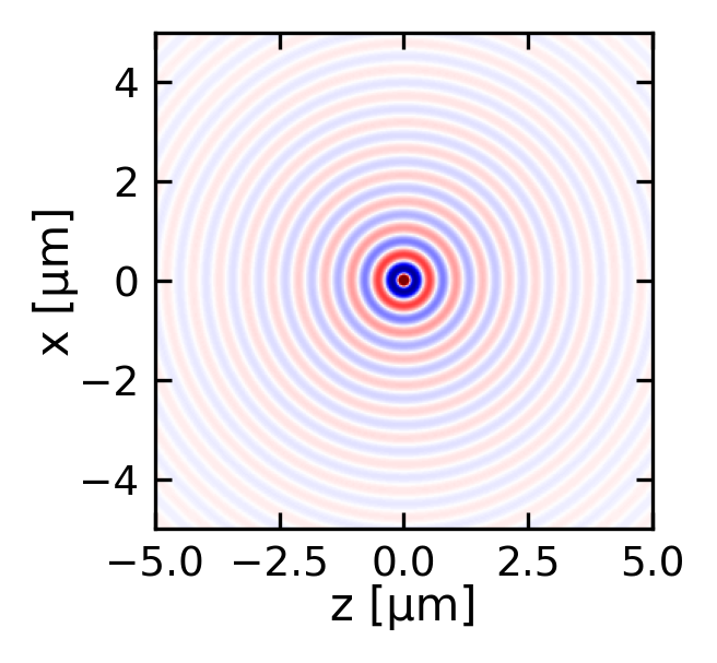 Spherical wave propagation. The wave is emitted from the origin and propagates in the positive z-direction. The wavefronts are spherical surfaces. The wave is visualized in the xz-plane.