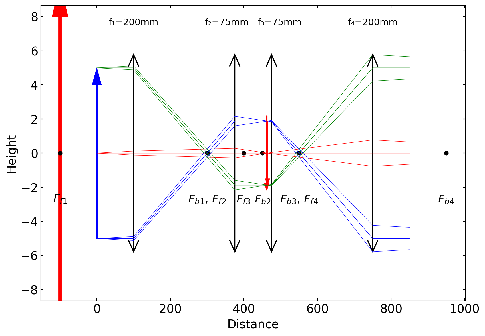 # Example of optical cloaking with four lenses using raytracingfrom raytracing import*# Define focal lengths (in mm)f1 =200f2 =75f3 = f2 # f3 = f2 = 75f4 = f1 # f4 = f1 = 200# Create an optical pathpath = ImagingPath()# Add the four lenses with proper spacingpath.append(Space(d=100)) # Initial space before first lenspath.append(Lens(f=f1, label=f"f₁={f1}mm"))path.append(Space(d=f1+f2)) # Distance between lens 1 and 2path.append(Lens(f=f2, label=f"f₂={f2}mm"))path.append(Space(d=100)) # Distance between lens pairs (d₀)path.append(Lens(f=f3, label=f"f₃={f3}mm"))path.append(Space(d=f3+f4)) # Distance between lens 3 and 4path.append(Lens(f=f4, label=f"f₄={f4}mm"))path.append(Space(d=100)) # Final space after last lens# Display the ray path with custom figure sizepath.display(raysList=[ [Ray(y=5, theta=0)], [Ray(y=-5, theta=0)]], interactive=False)