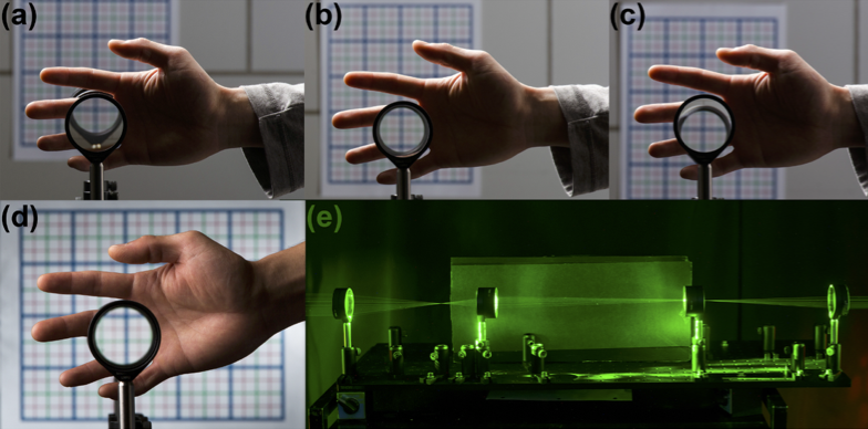 Figure 2— Example of a practical paraxial cloak. (a)–(c) A hand is cloaked for varying directions, while the background image is transmitted properly.(d) On-axis view of the ray optics cloaking device. (e) Setup using practical, easy to obtain optics, for demonstrating paraxial cloaking principles. (Photos by J. Adam Fenster, videos by Matthew Mann / University of Rochester) Source