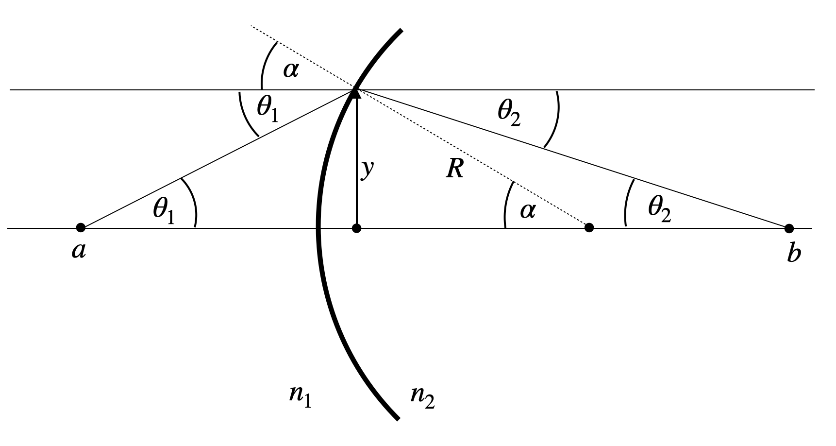 When light encounters a spherical boundary between two media, we can analyze its path using Snell’s law and geometric considerations as shown below: