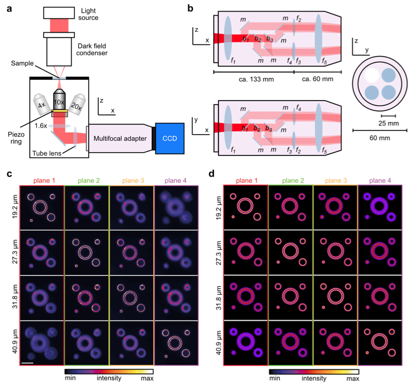Figure 3— The multifocal adapter. (a) Composition of the multifocal imaging setup. The multifocal adapter (MFA) is inserted into the light path between a standard dark-field microscope and a camera. (b) Composition of the multifocal adapter. Incoming light from the microscope is infinity projected by the lens f1 and split by three consecutive beam-splitters (b1 = 25/75; b2 = 33/67; b3 = 50/50). Five mirrors (m) guide the light into four separate optical paths. The lens f5 projects the four images onto the camera chip. The inter-plane distance is set by lenses of different focal length (f1 - f4). (c, d) Experimentally acquired (c) and simulated (d) (see Methods) multifocal dark-field images (planes 1 - 4, 20x objective) of a calibration grid at the four focal positions (indicated on the left side), where one of the four focal planes maps the grid sharply. Scale bar represents 20 µm. Experiment was performed six times with similar results. Source