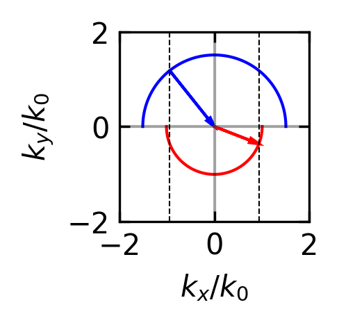 theta_upper = np.linspace(0, np.pi, 100) # Upper half circletheta_lower = np.linspace(np.pi, 2*np.pi, 100) # Lower half circle# Radii for the circlesr1 =1.51# Radius for upper half circler2 =1.01# Radius for lower half circlex_upper = r1 * np.cos(theta_upper)y_upper = r1 * np.sin(theta_upper)x_lower = r2 * np.cos(theta_lower)y_lower = r2 * np.sin(theta_lower)# Create the plotplt.figure(figsize=get_size(4, 3),dpi=150)plt.plot(x_upper, y_upper, 'b-', label=f'Upper radius = {r1}')plt.plot(x_lower, y_lower, 'r-', label=f'Lower radius = {r2}')# Add arrow# Calculate arrow start point (on the upper circle at 135 degrees)arrow_start_x = r1 * np.cos(3*np.pi/4.2) # 135 degrees in radiansarrow_start_y = r1 * np.sin(3*np.pi/4.2)# Add arrow to origin (0,0)plt.arrow(arrow_start_x, arrow_start_y, -arrow_start_x, -arrow_start_y, head_width=0.1, head_length=0.2, fc='b', ec='b', length_includes_head=True, label='45° arrow')dy=np.sqrt(r2**2-arrow_start_x**2)plt.arrow(0, 0, -arrow_start_x, -dy, head_width=0.1, head_length=0.2, fc='r', ec='r', length_includes_head=True, label='45° arrow')plt.axhline(y=0, color='k', linestyle='-', alpha=0.3)plt.axvline(x=0, color='k', linestyle='-', alpha=0.3)plt.axvline(x=-arrow_start_x, color='k', linestyle='--',lw=0.5)plt.axvline(x=arrow_start_x, color='k', linestyle='--', lw=0.5)plt.axis('square')plt.grid(True, alpha=0.3)plt.xlabel(r'$k_x/k_0$')plt.ylabel(r'$k_y/k_0$')plt.xlim(-2,2 )plt.ylim(-2,2 )# Show the plotplt.show()