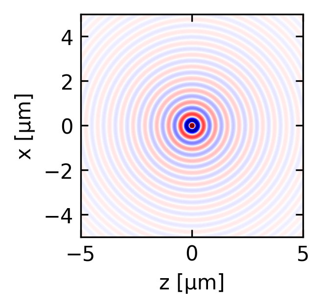Figure 5— Spherical wave propagation. The wave is emitted from the origin and propagates in the positive z-direction. The wavefronts are spherical surfaces. The wave is visualized in the xz-plane.