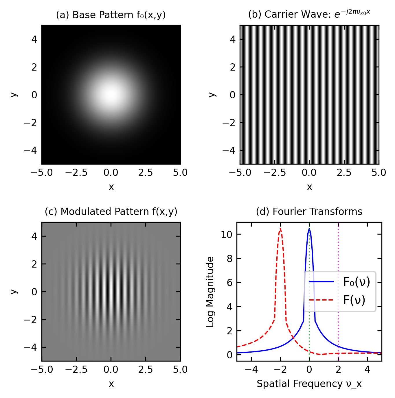 # Set up the coordinate systemx = np.linspace(-5, 5, 500)y = np.linspace(-5, 5, 500)X, Y = np.meshgrid(x, y)# Parameterswavelength =0.5# arbitrary unitsnu_x0 =2.0# carrier spatial frequencytheta_x0 = np.rad2deg(np.arcsin(wavelength * nu_x0)) # corresponding angle# Create base pattern f₀(x,y) - using a Gaussian patternsigma =1.5f0 = np.exp(-(X**2+ Y**2)/(2*sigma**2))# Create carrier wavecarrier = np.exp(-1j*2*np.pi*nu_x0*X)# Create modulated patternf = f0 * carrier# Calculate 2D Fourier transformsF0 = np.fft.fftshift(np.fft.fft2(f0))F = np.fft.fftshift(np.fft.fft2(f))# Create frequency axesfreq_x = np.fft.fftshift(np.fft.fftfreq(len(x), x[1]-x[0]))freq_y = np.fft.fftshift(np.fft.fftfreq(len(y), y[1]-y[0]))# Create figure with 4 subplotsfig, axs = plt.subplots(2, 2, figsize=get_size(12, 12))axs = axs.flatten()# Plot the base pattern f₀(x,y)im0 = axs[0].imshow(f0, extent=[x.min(), x.max(), y.min(), y.max()], cmap='gray', origin='lower')axs[0].set_title('(a) Base Pattern f₀(x,y)')axs[0].set_xlabel('x')axs[0].set_ylabel('y')# Plot the carrier wave (real part)im1 = axs[1].imshow(np.real(carrier), extent=[x.min(), x.max(), y.min(), y.max()], cmap='gray', origin='lower')axs[1].set_title(f'(b) Carrier Wave: $e^{{-j2\\pi\\nu_{{x0}}x}}$')axs[1].set_xlabel('x')axs[1].set_ylabel('y')# Plot the modulated pattern (real part)im2 = axs[2].imshow(np.real(f), extent=[x.min(), x.max(), y.min(), y.max()], cmap='gray', origin='lower')axs[2].set_title('(c) Modulated Pattern f(x,y)')axs[2].set_xlabel('x')axs[2].set_ylabel('y')# Plot Fourier transforms (log magnitude to enhance visibility)# Plot along central row in frequency space (freq_y = 0)central_row =len(freq_y) //2axs[3].plot(freq_x, np.log(np.abs(F0[central_row, :]) +1), 'b-', label='F₀(ν)')axs[3].plot(freq_x, np.log(np.abs(F[central_row, :]) +1), 'r--', label='F(ν)')axs[3].set_title('(d) Fourier Transforms')axs[3].set_xlabel('Spatial Frequency ν_x')axs[3].set_ylabel('Log Magnitude')axs[3].legend()# Add markers to show the shift to ν₀axs[3].axvline(x=0, color='g', linestyle=':', alpha=0.7, label='Original Center')axs[3].axvline(x=nu_x0, color='m', linestyle=':', alpha=0.7, label=f'Shifted Center (ν₀={nu_x0})')#axs[3].text(nu_x0 + 0.1, axs[3].get_ylim()[1]*0.9, f'θ₀={theta_x0:.1f}°', color='m')# Limit frequency axis for better visibilityaxs[3].set_xlim(-5, 5)plt.tight_layout()plt.show()