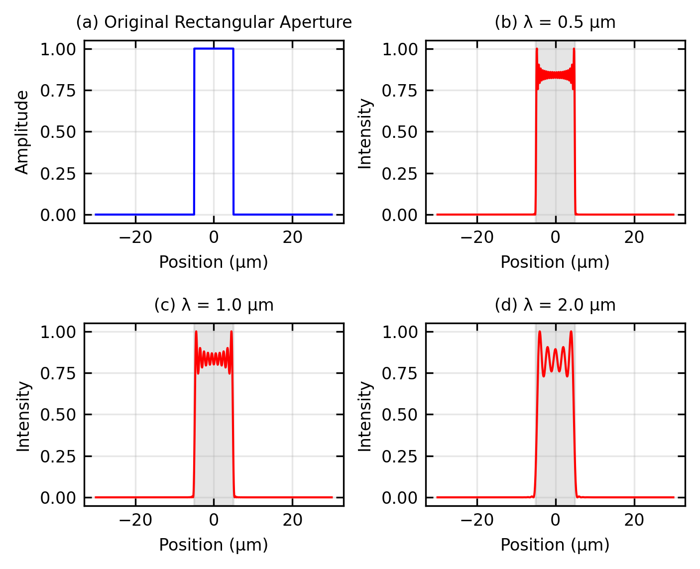 # Set parameterswidth =10# width of rectangular hole in μmx = np.linspace(-30, 30, 1000) # spatial coordinate in μmdx = x[1] - x[0] # spatial step sizecutoff_wavelengths = [0.5, 1.0, 2.0] # wavelengths in μm# Create rectangular function (1 inside the aperture, 0 outside)rect = np.zeros_like(x)rect[np.abs(x) <= width/2] =1# Calculate spatial frequency axisfreq = np.fft.fftshift(np.fft.fftfreq(len(x), dx))# Calculate Fourier transformrect_ft = np.fft.fftshift(np.fft.fft(rect))# Create figurefig, axs = plt.subplots(2, 2, figsize=get_size(12,10))axs = axs.flatten()# Plot original rectangular apertureaxs[0].plot(x, rect, 'b-')axs[0].set_title('(a) Original Rectangular Aperture')axs[0].set_xlabel('Position (μm)')axs[0].set_ylabel('Amplitude')axs[0].grid(True, alpha=0.3)# For each cutoff wavelength, apply filter and reconstructfor i, wavelength inenumerate(cutoff_wavelengths):# Create low-pass filter based on cutoff frequency cutoff_freq =1/wavelength # cutoff frequency in cycles/μm lowpass_filter = np.zeros_like(freq, dtype=complex) lowpass_filter[np.abs(freq) <= cutoff_freq] =1.0# Apply filter filtered_ft = rect_ft * lowpass_filter# Inverse Fourier transform to get reconstructed signal reconstructed = np.fft.ifft(np.fft.ifftshift(filtered_ft))# Calculate intensity (magnitude squared) intensity = np.abs(reconstructed)**2# Normalize for display intensity = intensity / np.max(intensity)# Plot reconstructed intensity axs[i+1].plot(x, intensity, 'r-') axs[i+1].set_title(f'({"bcd"[i]}) λ = {wavelength} μm') axs[i+1].set_xlabel('Position (μm)') axs[i+1].set_ylabel('Intensity') axs[i+1].grid(True, alpha=0.3)# Highlight the original aperture region axs[i+1].axvspan(-width/2, width/2, color='gray', alpha=0.2)plt.tight_layout()plt.show()