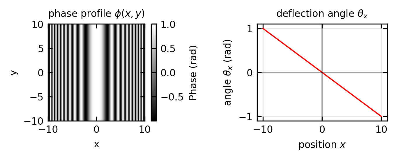 Figure 12— Phase function of a cylindrical Fourier lens. (left) The 2D phase profile showing how phase varies quadratically with x. (right) The resulting deflection angle as a function of position, showing the linear relationship that causes focusing.