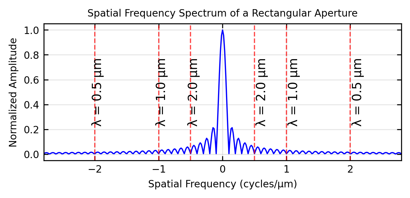 # Set parameterswidth =10# width of rectangular hole in μmx = np.linspace(-30, 30, 1000) # spatial coordinate in μmwavelengths = [0.5, 1.0, 2.0] # example wavelengths in μm# Create rectangular function (1 inside the aperture, 0 outside)rect = np.zeros_like(x)rect[np.abs(x) <= width/2] =1# Calculate spatial frequency axisdx = x[1] - x[0]freq = np.fft.fftshift(np.fft.fftfreq(len(x), dx))# Calculate Fourier transform (sinc function for a rectangular aperture)rect_ft = np.fft.fftshift(np.fft.fft(rect)) /len(x)rect_ft_mag = np.abs(rect_ft)# Create figureplt.figure(figsize=get_size(12, 6))# Plot the spectrumplt.plot(freq, rect_ft_mag / np.max(rect_ft_mag), 'b-', label='Spectrum')# Plot cutoff frequencies for different wavelengthsfor wavelength in wavelengths: cutoff =1/wavelength # cutoff frequency in cycles/μm plt.axvline(x=cutoff, color='r', linestyle='--', alpha=0.7) plt.axvline(x=-cutoff, color='r', linestyle='--', alpha=0.7)# Fix the label position to be near the corresponding cutoff line plt.text(cutoff+0.02, 0.5, f'λ = {wavelength} μm', rotation=90, va='center')# Add label for negative cutoff too plt.text(-cutoff-0.05, 0.5, f'λ = {wavelength} μm', rotation=90, va='center')# Add annotations#plt.text(0, 0.8, f'width = {width} μm', ha='center')#plt.annotate('sinc function', xy=(0.2, 0.5), xytext=(0.3, 0.7),# arrowprops=dict(arrowstyle='->'))plt.xlabel('Spatial Frequency (cycles/μm)')plt.ylabel('Normalized Amplitude')plt.xlim(-2.8, 2.8)plt.grid(True, alpha=0.3)plt.title('Spatial Frequency Spectrum of a Rectangular Aperture')plt.tight_layout()plt.show()