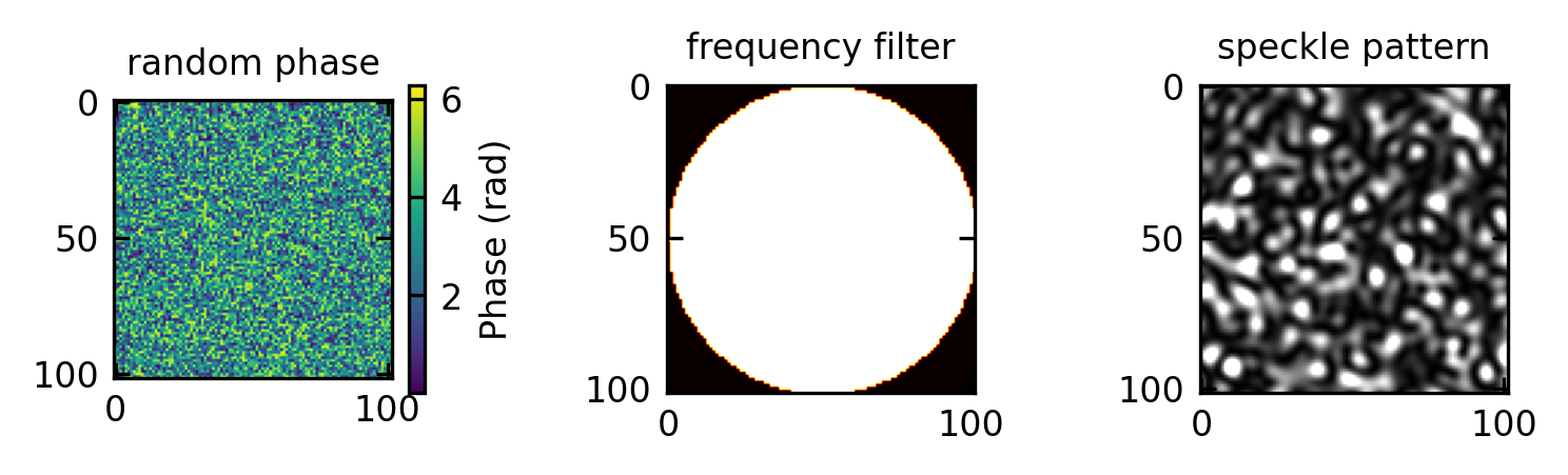 # Code to generate and display a simulated speckle patternfrom scipy.ndimage import gaussian_filter# Create random phase screenN =512random_phase =2*np.pi*np.random.rand(N, N)# Apply some spatial correlation to the phase to get more realistic speckle# First generate complex fieldfield = np.exp(1j* random_phase)# Apply aperture (spatial filtering) to control speckle sizeaperture = np.zeros((N, N))aperture_radius = N//10center = N//2y, x = np.ogrid[:N, :N]mask = (x - center)**2+ (y - center)**2<= aperture_radius**2aperture[mask] =1# Apply aperture in Fourier domain (equivalent to spatial filtering)field_ft = np.fft.fftshift(np.fft.fft2(field))filtered_field_ft = field_ft * aperturespeckle_field = np.fft.ifft2(np.fft.ifftshift(filtered_field_ft))# Calculate intensity pattern (square of the field amplitude)speckle_pattern = np.abs(speckle_field)**2# Display resultsfig, axs = plt.subplots(1, 3, figsize=get_size(13, 4))# Crop phase screen to same dimensions as aperture for consistent displayphase_display = random_phase[center-aperture_radius:center+aperture_radius, center-aperture_radius:center+aperture_radius]# Crop aperture to same dimensions for consistent displayaperture_display = aperture[center-aperture_radius:center+aperture_radius, center-aperture_radius:center+aperture_radius]# Crop speckle pattern to same size for consistencyspeckle_display = speckle_pattern[center-aperture_radius:center+aperture_radius, center-aperture_radius:center+aperture_radius]# Plot phase screen with consistent dimensionsim0 = axs[0].imshow(phase_display, cmap='viridis')axs[0].set_title('random phase')plt.colorbar(im0, ax=axs[0], label='Phase (rad)')# Plot aperture with consistent dimensionsim1 = axs[1].imshow(aperture_display, cmap='hot')axs[1].set_title('frequency filter')# Plot speckle pattern with consistent dimensionsim2 = axs[2].imshow(speckle_display, cmap='gray', vmax=3*np.mean(speckle_display))axs[2].set_title('speckle pattern')plt.tight_layout()plt.show()