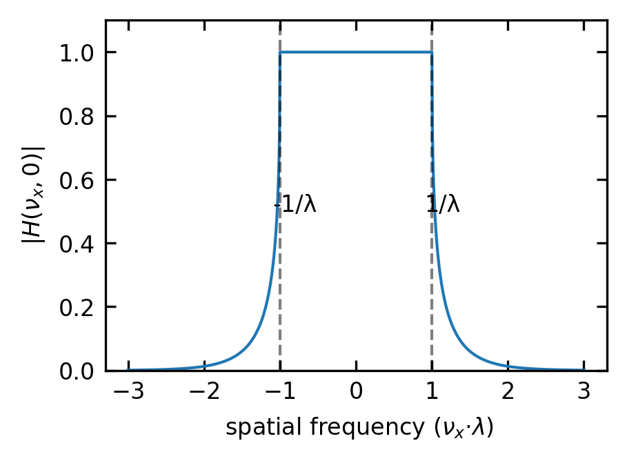 # Parameterswavelength =0.5# wavelength in arbitrary unitsz_distances = [.2] # distances for transfer function calculationnu_x = np.linspace(-3/wavelength, 3/wavelength, 1000) # spatial frequency rangenu_y =0# setting nu_y = 0 for a 1D plot along nu_x# Calculate the magnitude of the transfer function for different z valuesH_mags = []for d in z_distances:# Calculate k_z based on spatial frequencies k_z_squared = (1/wavelength)**2- nu_x**2- nu_y**2# Initialize transfer function array H = np.ones_like(nu_x, dtype=complex)# For propagating waves (real k_z) prop_mask = k_z_squared >=0 k_z_prop = np.sqrt(k_z_squared[prop_mask]) H[prop_mask] = np.exp(-1j*2* np.pi * k_z_prop * d)# For evanescent waves (imaginary k_z) evan_mask = k_z_squared <0 k_z_evan = np.sqrt(-k_z_squared[evan_mask]) H[evan_mask] = np.exp(-2* np.pi * k_z_evan * d)# Store the magnitude H_mags.append(np.abs(H))# Plot the magnitude of the transfer functionplt.figure(figsize=get_size(8, 6))for i, d inenumerate(z_distances): plt.plot(nu_x*wavelength, H_mags[i], label=f'z = {d}')plt.axvline(x=-1, color='k', linestyle='--', alpha=0.5)plt.axvline(x=1, color='k', linestyle='--', alpha=0.5)plt.text(-1.1, 0.5, '-1/λ', fontsize=8)plt.text(0.9, 0.5, '1/λ', fontsize=8)plt.xlabel(r' spatial frequency $(\nu_x·\lambda)$')plt.ylabel(r'$|H(\nu_x, 0)|$')#plt.legend()plt.ylim(0, 1.1)plt.tight_layout()plt.show()
