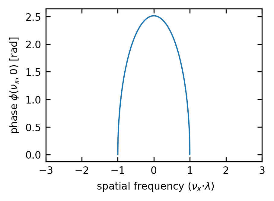 # Parameterswavelength =0.5# wavelength in arbitrary unitsz_distances = [0.2] # different propagation distancesnu_x = np.linspace(-1/wavelength, 1/wavelength, 1000) # spatial frequency range (propagating waves only)nu_y =0# setting nu_y = 0 for a 1D plot along nu_x# Calculate the phase of the transfer function for different z valuesH_phases = []for d in z_distances:# Calculate k_z for propagating waves only k_z =2* np.pi * np.sqrt((1/wavelength)**2- nu_x**2- nu_y**2)# Calculate the phase (negative argument of the transfer function) phase = k_z * d# Store the phase H_phases.append(phase)# Plot the phase of the transfer functionplt.figure(figsize=get_size(8, 6))for i, d inenumerate(z_distances): plt.plot(nu_x*wavelength, H_phases[i], label=f'z = {d}')plt.xlabel(r' spatial frequency $(\nu_x·\lambda)$')plt.ylabel(r'phase $\phi(\nu_x, 0)$[rad]')plt.xlim(-3,3)plt.tight_layout()plt.show()