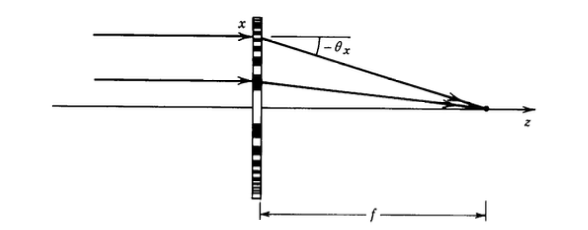 This phase profile causes the wave at position \((x, y)\) to be deflected by angles \(\theta_x= \sin^{-1}(\lambda \partial \phi / \partial x)=\sin^{-1}(-x / f)\) and \(\theta_y=0\). For small values where \(|x / f| \ll 1\), the deflection angle simplifies to \(\theta_x \approx-x / f\), creating a linear relationship between deflection angle and position. When a plane wave illuminates this transparency, each point of the wavefront experiences a position-dependent deflection, transforming the overall wavefront shape. At each position \(x\), the local wavevector is redirected by an angle \(-x / f\), causing all light rays to converge at a focal point located at distance \(f\) from the transparency along the optical axis, as illustrated below.