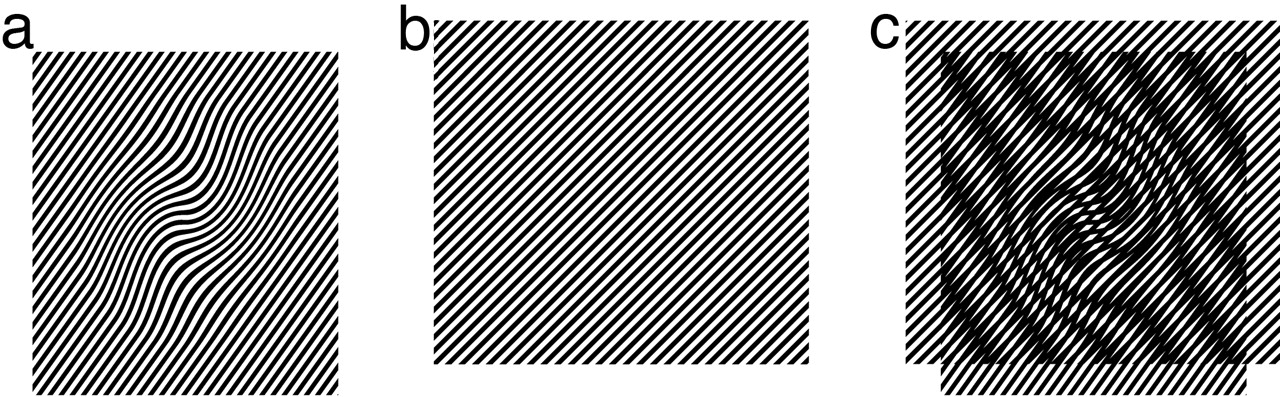 Figure 8— The moiré effect in SIM. When a sample with high spatial frequency features is illuminated with a structured pattern, the interference creates moiré fringes at lower frequencies that can be detected by the microscope. This allows information about sub-diffraction structures to be encoded in observable signals. (see Gustafsson, M. G. L. Nonlinear structured-illumination microscopy: Wide-field fluorescence imaging with theoretically unlimited resolution. Proc. Natl. Acad. Sci. 102, 13081–13086 (2005))