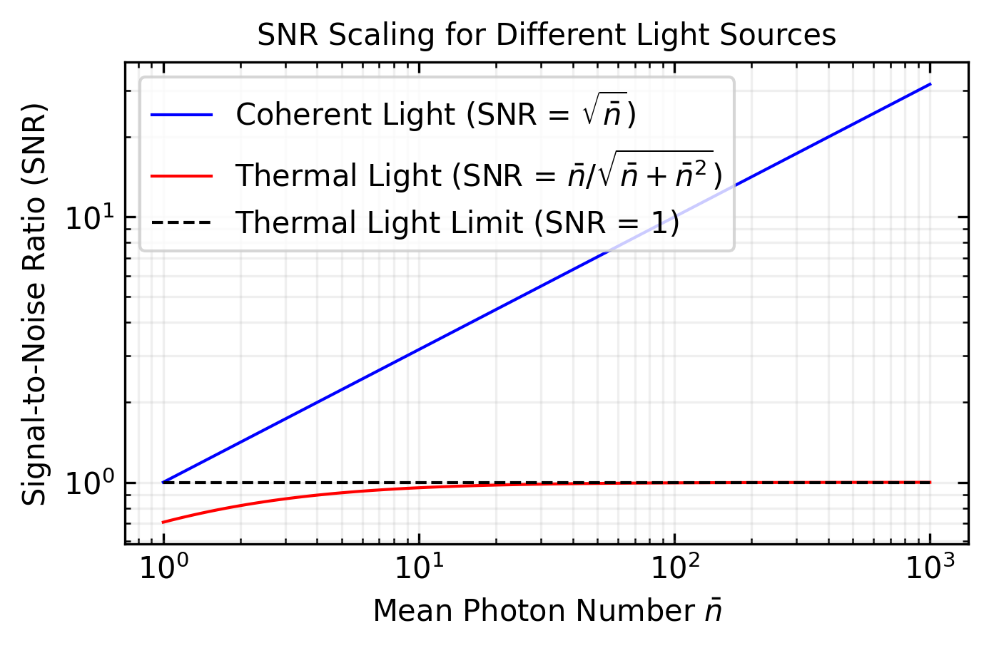 # Range of mean photon numbers mean_values = np.logspace(0, 3, 100)# Calculate SNR for coherent (Poisson) light snr_coherent = np.sqrt(mean_values)# Calculate SNR for thermal light snr_thermal = mean_values / np.sqrt(mean_values + mean_values**2) plt.figure(figsize=get_size(12,8)) plt.loglog(mean_values, snr_coherent, 'b-', label='Coherent Light (SNR = $\\sqrt{\\bar{n}}$)') plt.loglog(mean_values, snr_thermal, 'r-', label='Thermal Light (SNR = $\\bar{n}/\\sqrt{\\bar{n}+\\bar{n}^2}$)') plt.loglog(mean_values, np.ones_like(mean_values), 'k--', label='Thermal Light Limit (SNR = 1)') plt.xlabel('Mean Photon Number $\\bar{n}$') plt.ylabel('Signal-to-Noise Ratio (SNR)') plt.title('SNR Scaling for Different Light Sources') plt.grid(True, which="both", ls="-", alpha=0.2) plt.legend() plt.tight_layout() plt.show()